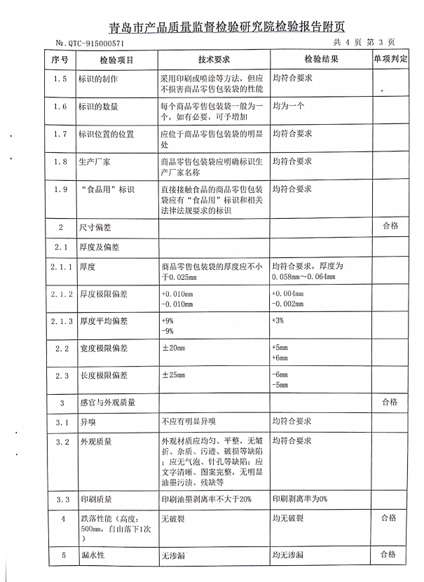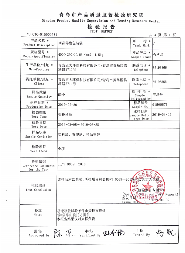 青島正大環(huán)保生產(chǎn)的零售商品包裝袋400*260*0.06mm順利通過青島質(zhì)量監(jiān)督檢查院檢測